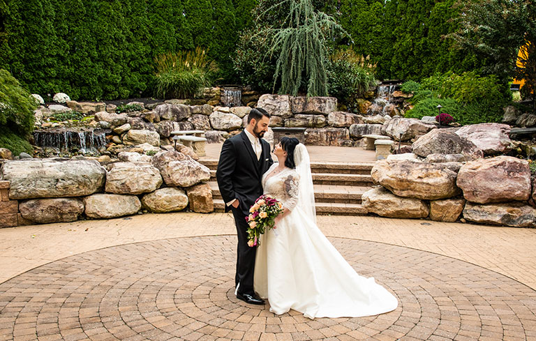 The palace garden is a private oasis with a beautiful backdrop of waterfalls and perfectly manicured landscape that can accommodate 200 guests.The lush gardens, greenery, and natural elements add contrast between the large European stone structures and the tranquility of the 32-foot-tall fountain and pond. The two European stone and wrought-iron gazebos add warmth and balance to the garden.